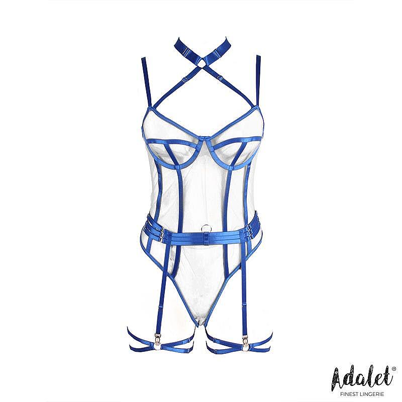 ADALET LINGERIE Killye Mesh Teddy with Strasps and Leg Rings (Blue), sieťované body s podväzkami