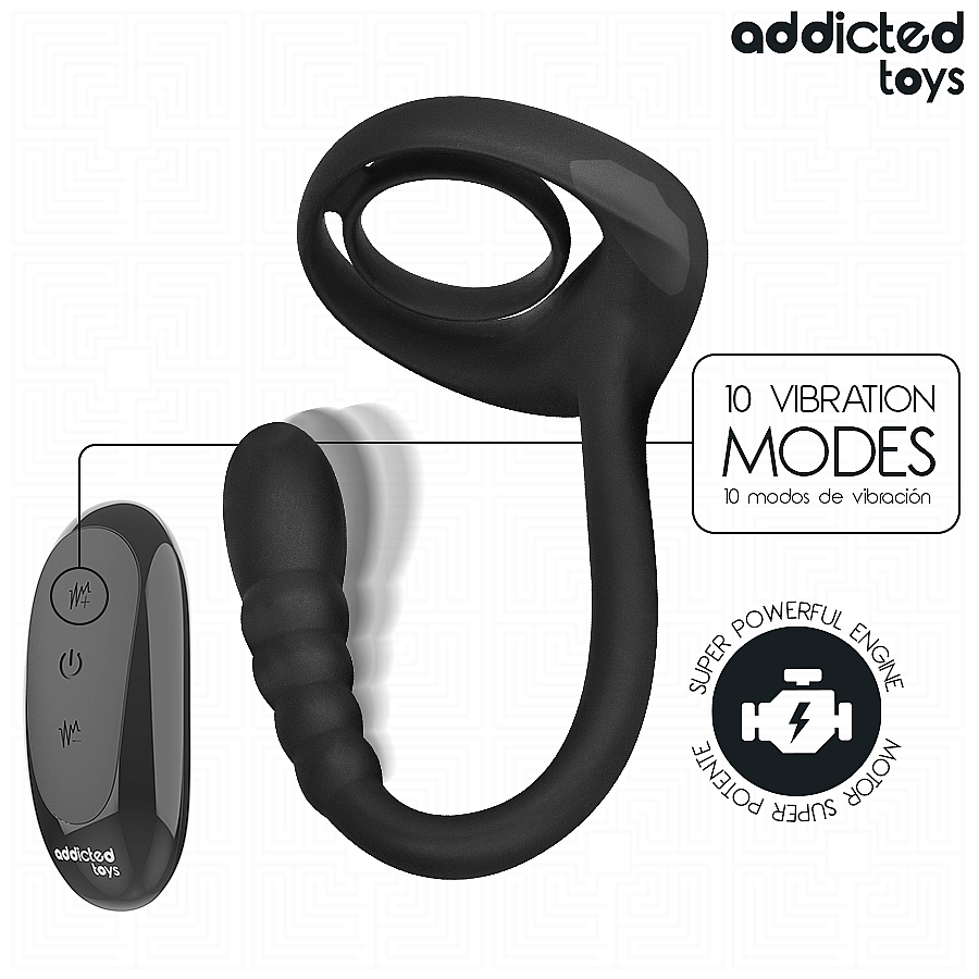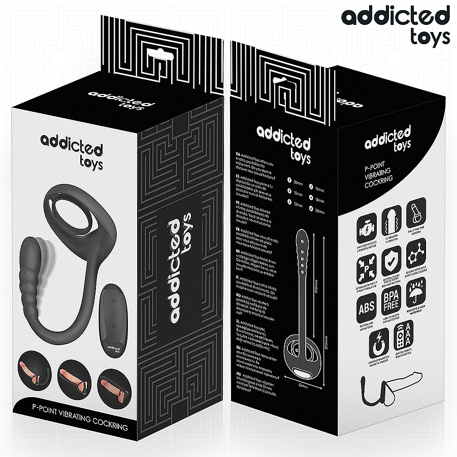 Addicted Toys P-Spot Vibrating Cock Ring v elegantnej čiernej s dvojicou supervýkonných motorov stimuluje penis aj P-bod (prostatu) naraz a rozochvie celé telo. Zahnutý, pružný tvar sa prirodzene prispôsobí a zacieli na najcitlivejšie miesta. 10 vibračných režimov ponúkne od jemných pulzov po intenzívne rytmy pre každú náladu. Bezdrôtové diaľkové ovládanie zmení každé stretnutie na vzrušujúcu hru – tempo udávate vy alebo partner. Medicínsky silikón s ABS je hodvábne hladký, telu bezpečný a bez ftalátov, takže nasadzovanie aj vniknutie sú príjemné a komfortné. Vodotesné prevedenie láka do sprchy či vane a magnetické nabíjanie drží krúžok pripravený na ďalšie kolo. Rozmery (dĺžka 21,5 cm, zasunuteľná 19,5 cm, šírka 6,8 cm) garantujú ergonomické sedenie a presnú stimuláciu tam, kde ju chcete.