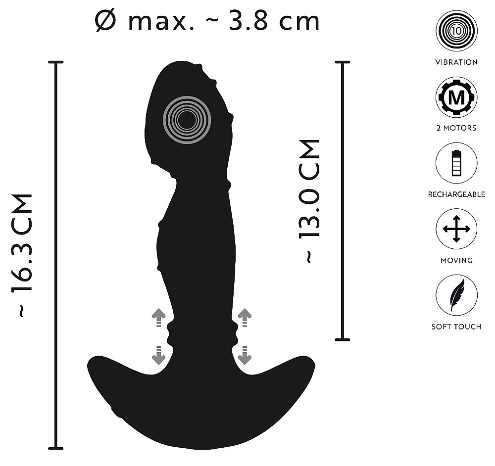 Vibrating Prostate Plug with Moving Rings od ANOS má precízne zakrivenú, drážkovanú špičku, ktorá presne trafí P-bod a zaplaví ho intenzívnymi vibráciami. Pohyblivé krúžky kĺžu hore a dolu po análnom vchode a napodobňujú horúci rimming, ktorý privádza dych k varu. 10 vibračných režimov a 3 rýchlosti masáže krúžkov môžete ľubovoľne kombinovať – výsledok je vždy vzrušujúci. Dva silné, no tiché motory pracujú spoľahlivo a posielajú do hĺbky vlny rozkoše. Ovládanie je jednoduché jedným tlačidlom na bezpečnej kotvovitej základni, takže máte všetko pod palcom. Hodvábne jemný silikón hladko kĺže, je pohodlný pri nosení a zvládne aj dlhšie hry. Široká zarážka drží kolík na mieste a bráni prílišnému zasunutiu, aby ste si užívali bezpečne a naplno. Keď je čas dobiť, stačí siahnuť po USB kábli a ste rýchlo späť v hre.