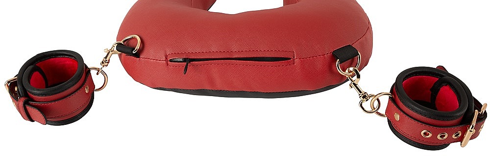 Bad Kitty Thigh Restraint Set with Neck Cushion and Handcuffs od značky Bad Kitty prináša premyslené spojenie pohodlia, štýlu a erotickej kontroly. Luxusná kombinácia červenej a čiernej imitácie kože so zlatými doplnkami pôsobí výrazne, zvodne a elegantne zároveň. Mäkký, ergonomicky tvarovaný krčný vankúš poskytuje príjemnú oporu a spríjemňuje aj dlhšie hrátky. Nastaviteľné slučky na stehná pomáhajú stabilne držať požadovanú polohu a otvárajú priestor pre intenzívnejšie partnerské scenáre. Odnímateľné putá na ruky dodávajú celej sade ďalšiu úroveň variability, takže si jednoducho prispôsobíte mieru obmedzenia aj štýl hry. Vďaka mäkkému povrchu z imitácie kože a jemnému polstrovaniu je kontakt s pokožkou príjemný a vhodný aj na dlhšie používanie. Putá sa rýchlo nasadzujú, upravujú pomocou praciek a vďaka karabínam ich možno ľahko pripnúť ku krčnému vankúšu, odopnúť alebo spojiť k sebe ako klasické putá. Výsledkom je rafinovaná BDSM pomôcka, ktorá spája fixáciu, pohodlie a dráždivý vizuálny efekt v jednom štýlovom celku.