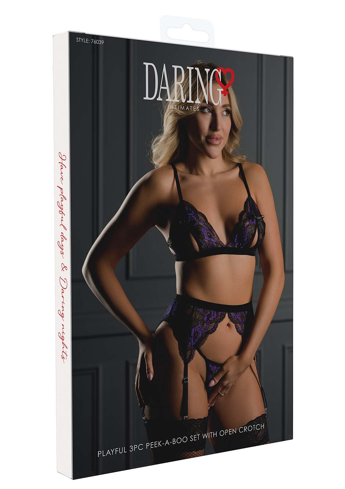 Daring Intimates 3PC Peek-A-Boo Bow Set Open Crotch (Purple) od Daring Intimates je zvodne odvážna – mäkká fialová čipka hladí pokožku a sametový pás obopína telo pre dokonale zvýraznené krivky. Otvorené košíčky podprsenky lákajú pohľadom a pozývajú k dotykom. Nohavičky s otvoreným rozkrokom sú neodolateľnou výzvou a každý zapnutý podväzok sľubuje ďalšie škádlenie. Nastaviteľné ramienka umožnia presné nastavenie pohodlia, kým pružný strih sa prispôsobí telu a nechá vás tancovať medzi nehou a vášňou. Super jemná čipka je príjemná aj pri dlhšom nosení a ľahká konštrukcia vás nebude obmedzovať ani pri najdivokejších hrách. Fialová farba zvýrazní odvážny štýl a 3-dielne prevedenie s podprsenkou, nohavičkami a podväzkovým pásom prináša množstvo kombinácií. Sametový pás dodá kvapku luxusu, nastaviteľné podväzky držia pančuchy tam, kde chcete, a otvorené detaily šteklia pri každom kroku.