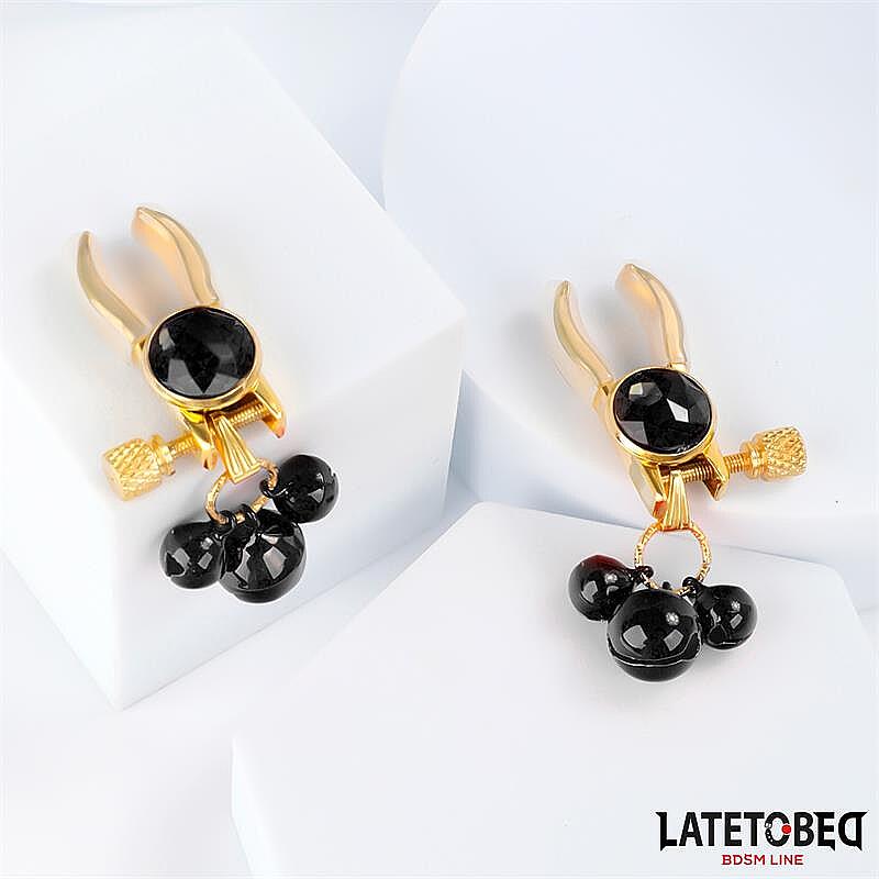 LATETOBED BDSM LINE Nipple Clamps with Bell od značky LATETOBED sú vytvorené pre milovníkov intenzívnych a temnejších pôžitkov, ktorí chcú štýlovú aj funkčnú erotickú pomôcku. Menšie prevedenie klipsov pôsobí decentnejšie než bežné svorky, a tak prináša presnejší prítlak a zvodný pocit kontroly. Kovové spracovanie zaručuje pevnosť, odolnosť a príjemne chladivý dotyk, ktorý vie vzrušenie ešte zvýrazniť. Ozdobné čierne rolničky prinášajú hravý zvukový efekt, ktorý podčiarkne každý pohyb a premení intímnu hru na ešte intenzívnejší zážitok. Lesklé kamienkové detaily navyše dodávajú celku luxusný, elegantný a neodolateľne provokatívny vzhľad.