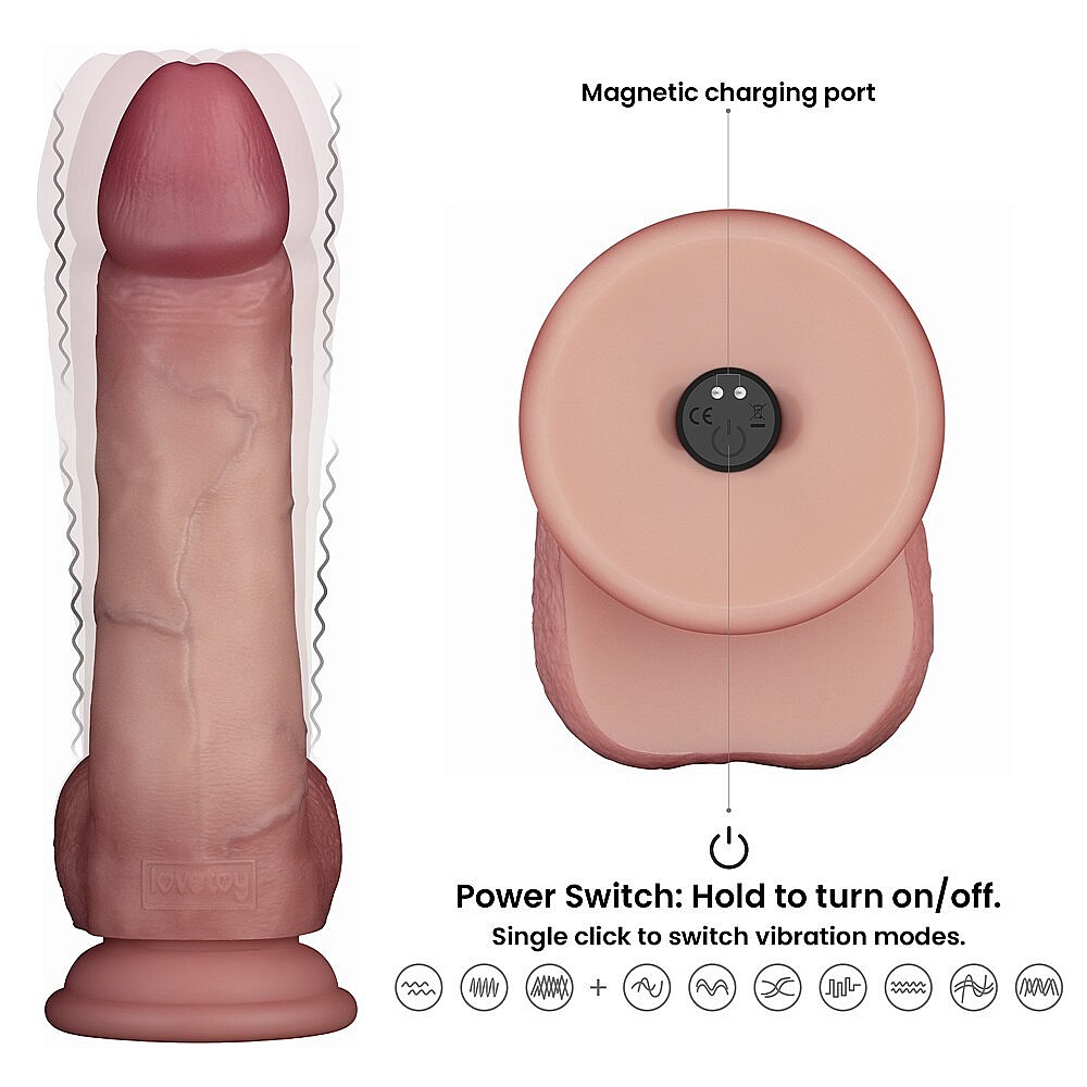 Lovetoy Sliding Skin Pro II 8" Vibrating Silicone Dong od značky Lovetoy prináša vylepšenú technológiu sliding-skin, ktorá posúva realistický zážitok ešte ďalej. Jemná vonkajšia vrstva z medicínskeho silikónu pôsobí hebko a prirodzene, zatiaľ čo pevnejšie vnútorné jadro napodobňuje pocit stoporeného penisu. Dvojitá hustota materiálu tak vytvára mimoriadne presvedčivú stimuláciu a komfort pri používaní. Hračka ponúka 10 vibračných režimov, vďaka ktorým si ľahko nastavíte presne takú intenzitu, akú si vaše telo práve žiada. Bezdrôtové diaľkové ovládanie prináša väčšiu voľnosť pohybu a viac možností pri sólových aj partnerských hrách. Praktické USB nabíjanie zvyšuje pohodlie pri pravidelnom používaní. Realistický tvar, delikátna textúra a prémiový dotyk materiálu robia z tejto pomôcky zmyselný a veľmi dráždivý doplnok pre chvíle, keď chcete viac než len obyčajnú stimuláciu. Pre ešte príjemnejšie kĺzanie sa odporúča použiť lubrikant na vodnej báze.