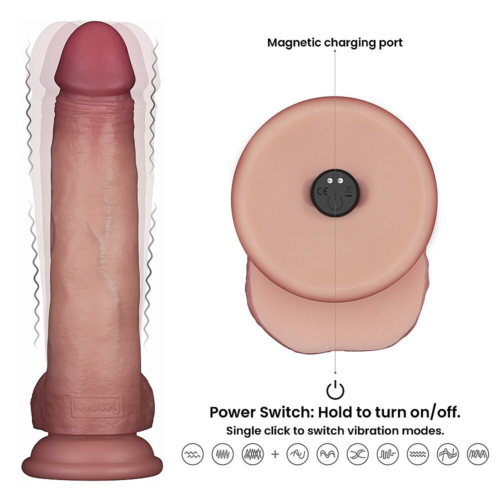 Lovetoy Sliding Skin Pro II 8,5" Vibrating Silicone Dong od značky Lovetoy prináša vylepšenú technológiu sliding-skin, ktorá posúva realistický zážitok ešte ďalej. Jemná vonkajšia vrstva z medicínskeho silikónu pôsobí hebko a prirodzene, zatiaľ čo pevnejšie vnútorné jadro napodobňuje pocit stoporeného penisu. Dvojitá hustota materiálu tak vytvára mimoriadne presvedčivú stimuláciu a komfort pri používaní. Hračka ponúka 10 vibračných režimov, vďaka ktorým si ľahko nastavíte presne takú intenzitu, akú si vaše telo práve žiada. Bezdrôtové diaľkové ovládanie prináša väčšiu voľnosť pohybu a viac možností pri sólových aj partnerských hrách. Praktické USB nabíjanie zvyšuje pohodlie pri pravidelnom používaní. Realistický tvar, delikátna textúra a prémiový dotyk materiálu robia z tejto pomôcky zmyselný a veľmi dráždivý doplnok pre chvíle, keď chcete viac než len obyčajnú stimuláciu. Pre ešte príjemnejšie kĺzanie sa odporúča použiť lubrikant na vodnej báze.