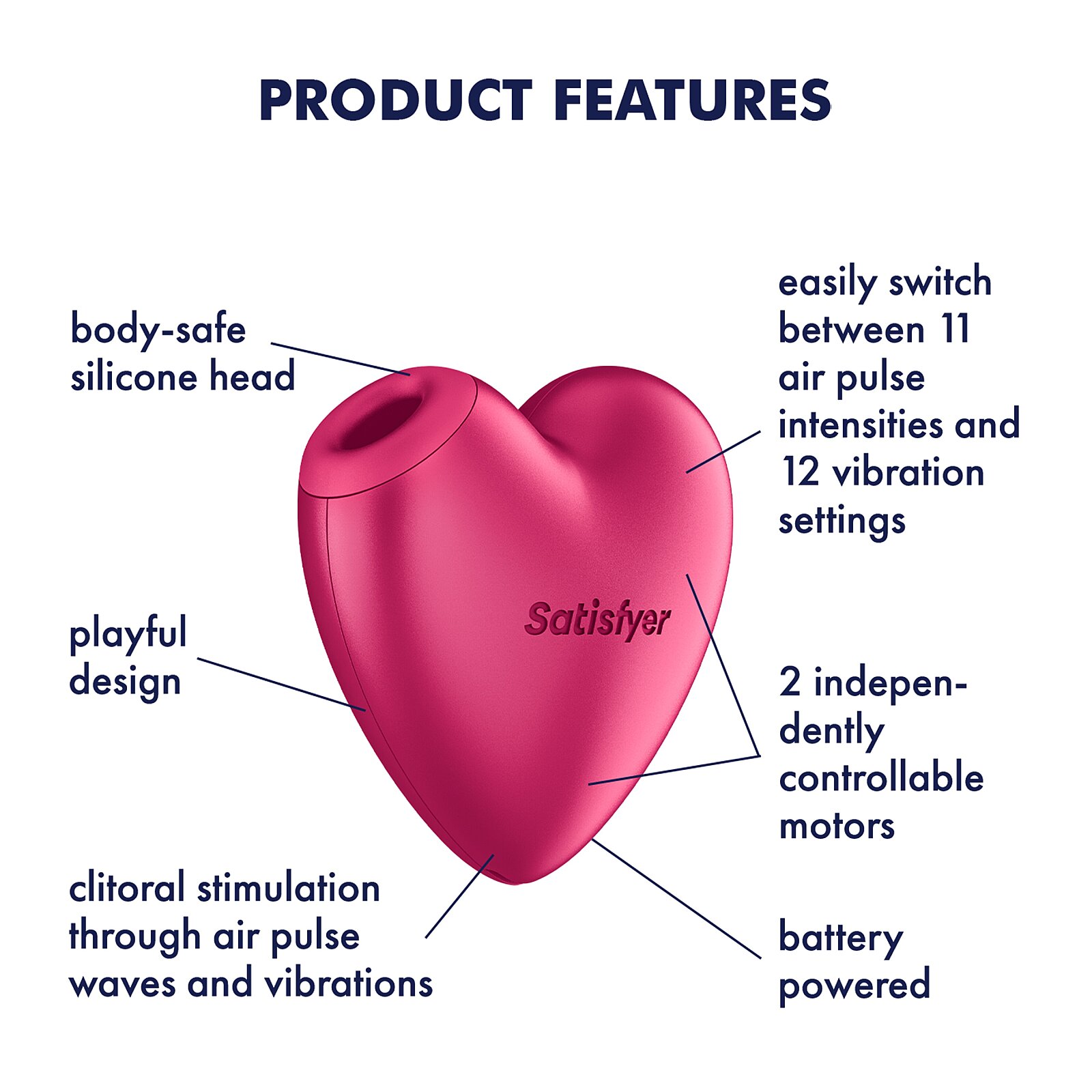 Model Cutie Heart Battery Series (Pink) od značky Satisfyer spája tlakové vlny a vibrácie pre intenzívnu klitorálnu rozkoš. Dva samostatne ovládateľné motory umožnia miešať 11 intenzít air-pulse s 12 programami vibrácií pre nekonečné kombinácie. Kompaktný srdiečkový tvar výborne sadne do ruky a je diskrétny aj na cestách. Hebký, telu bezpečný lekársky silikón je jemný k pokožke a výborne sa udržiava. Vodeodolnosť IPX6 láka do sprchy či vane, kým tichý režim ochotne zatají vašu potechu. Napájanie 2× AAA batériami (nie sú súčasťou) zaručí okamžité potešenie bez nabíjania – stačí vložiť a hra môže pokračovať.