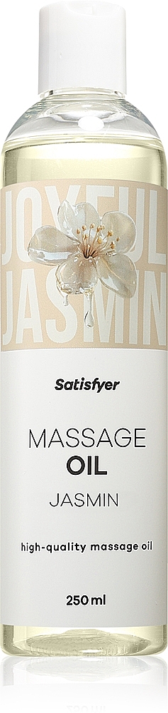 Satisfyer Massage Oil 250 ml (Jasmin) od Satisfyer je prémiový masážny olej s jemnou kvetinovou arómou, ktorá sa počas masáže krásne rozvíja, upokojuje, harmonizuje a prebúdza túžbu. Vyživujúce rastlinné oleje zanechávajú pokožku zamatovo hladkú, aby prsty kĺzali po tele ľahko a zvodne. Jazmín, oddávna symbol zmyselnosti, tu ukazuje svoju afrodiziakálnu silu – vytvára romantickú atmosféru a prehlbuje intimitu. Šetrná a všestranná formula dáva voľnosť hravosti, či už ide o celotelovú masáž, alebo o sústredenie na tie správne miesta. Stačí pár kvapiek do dlaní alebo priamo na pokožku – výživný účinok sa prejaví okamžite a podľa potreby môžete pridať. Slnečnicový, sójový a jojobový olej sa starajú o komfort, pružnosť i jemný lesk pokožky, kým aróma jazmínu pozýva k ďalšiemu kolu dotykov. Hebký sklz podporuje plynulé pohyby a necháva ruky maľovať po tele mapu rozkoše. Neutrálna a jemná receptúra je prispôsobivá – ideálna na romantickú predohru aj na relax po náročnom dni.