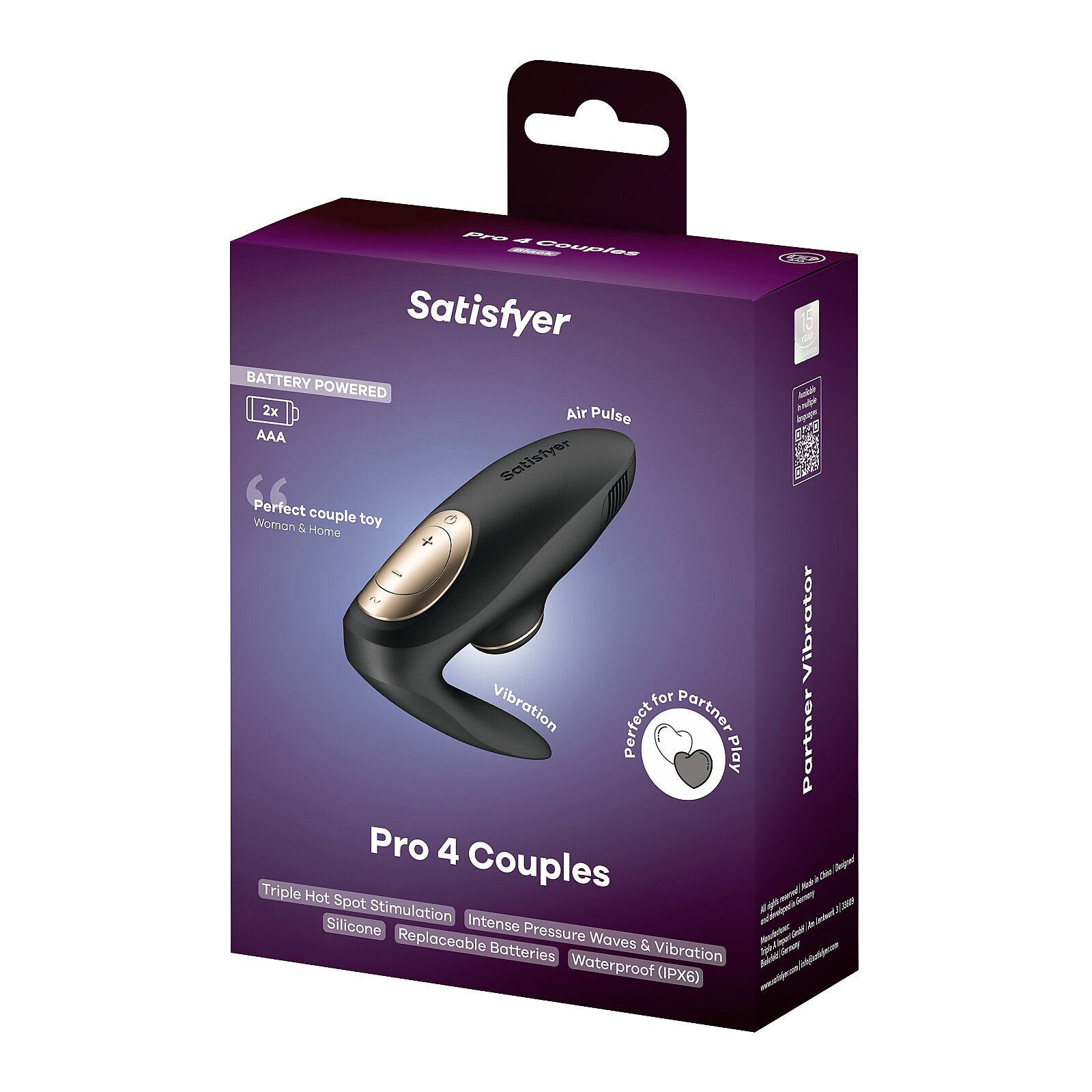 Satisfyer Pro 4 Couples Battery Series (Black) od značky Satisfyer spája bezdotykové tlakové vlny pre klitoris a vibračné vnútorné rameno pre bod G – dvojitá stimulácia, ktorá vás vzruší. Štíhle silikónové rameno sa jemne zasunie a s 12 programami vibrácií rozozvučí bod G do sladkých pulzov. Vonkajšia hlavica súčasne hladí klitoris 11 intenzitami Air Pulse, ktoré rozvibrujú túžbu a vystupňujú napätie až k ohromnému finále. Dva motory ovládate oddelene, takže si naladíte perfektnú kombináciu vĺn a vibrácií podľa chuti. Tichý režim šepká, keď chcete diskrétnosť, no výkon ostáva lákavo intenzívny. Vodotesnosť IPX6 volá do sprchy a dáva voľnosť hrám s vodou. Hebký, telu bezpečný silikón je príjemný na pokožke a po akcii sa ľahko čistí. Napájanie dvoma batériami AAA (nie sú súčasťou) ruší čakanie na nabíjanie – ideálne na cesty a spontánne potešenie.