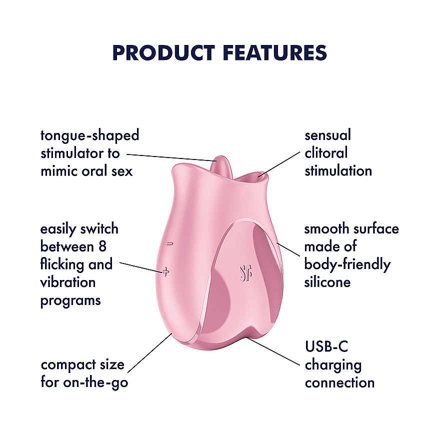Satisfyer Tongue Lover sa opiera o pevnú silikónovú špičku, ktorá verne imituje skutočné lízanie a cieli presne na klitoris. Super hebký silikón prenáša silné vibrácie intenzívne a jemne zároveň. 8 flicking pohybov a 8 vibračných programov ponúka od pomalého škádlenia po rýchly záťah k orgazmu. Ergonomický tvar s drážkou pre uchopenie drží pevne v ruke, aby ste sa mohli sústrediť len na pôžitok. Whisper mode udrží tajomstvo v tichosti a diskrétnosti. Vďaka vodotesnosti IPX7 sa vybláznite v sprche aj vo vani a čistenie je otázkou chvíľky. Nabíjanie cez USB‑C a lítium‑iónová batéria zaručia, že tento kompaktný spoločník je vždy pripravený – sólo aj v páre.