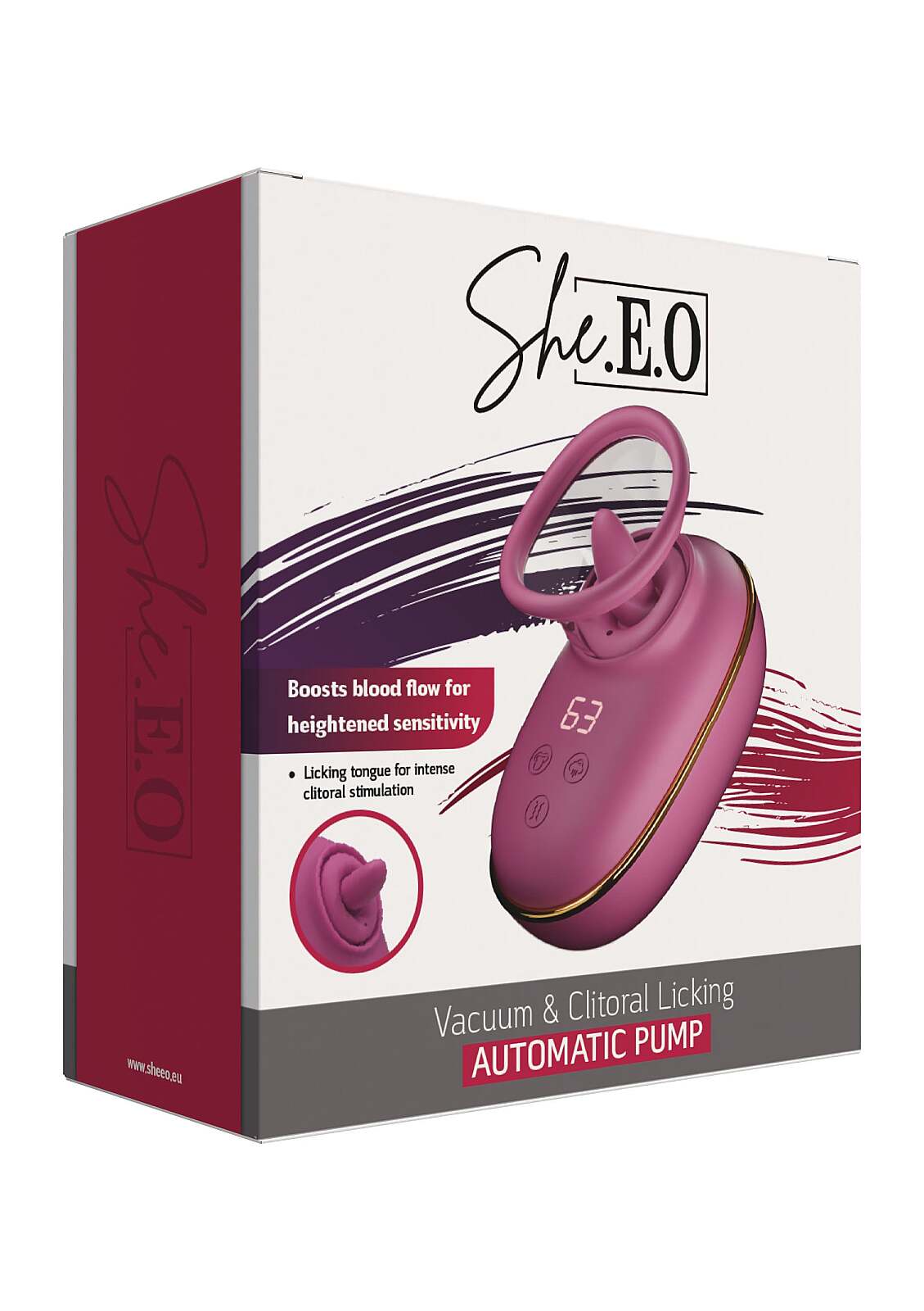 She.E.O prináša Licking Clitoral Automatic Pump, ktorá spája vákuum, lízanie a vibrácie pre intenzívnu stimuláciu. Mäkký rotujúci jazýček jemne masíruje klitoris alebo bradavky a jeho pohyb rozvibruje celé telo. Vákuový kalíšok zvyšuje prekrvenie a citlivosť, takže každý dotyk je hlbší. 9 režimov vibrácií a 9 rotácií vám dovolí nájsť presné tempo, zatiaľ čo 3 úrovne sania pridajú lahodný tlak. Jazýček možno používať aj bez kalíška – v tomto režime dosiahne hlbšie a stimuluje intenzívnejšie. Telo z telu bezpečného silikónu a ABS je hebké a hygienické. Ergonomický tvar skvele padne do ruky pre presné mierenie. USB nabíjanie a Li‑ion batéria ponúkajú až 65 minút potešenia po 150 minútach nabíjania. Vďaka IPX6 vodoodolnosti si užijete aj v sprche. Kompaktná dĺžka 11 cm a hmotnosť 285 g z nej robia ideálneho spoločníka doma i na cestách.
