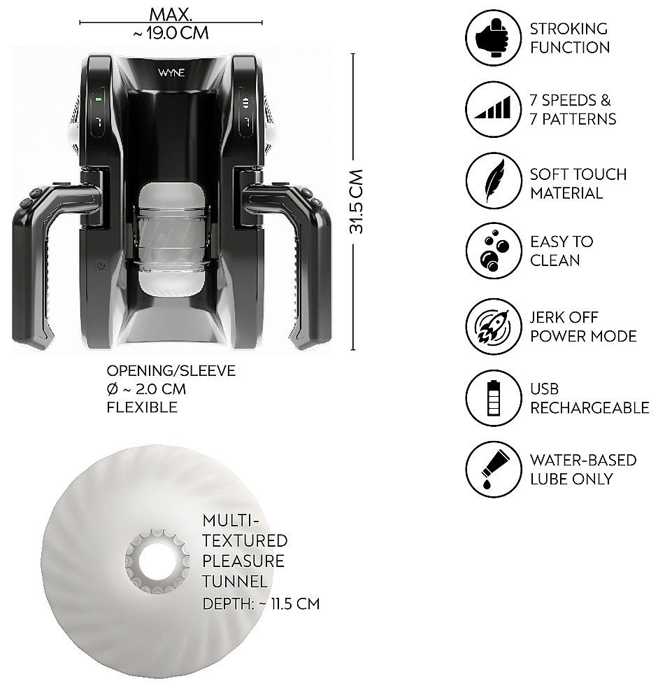 WYNE Masturbator 10 je navrhnutý pre plne automatické potešenie. Mäkký a pružný rukáv s množstvom jemných textúr masíruje penis po celej dĺžke. 5 rôznych dĺžok zdvihu umožní kratšie bleskové ťahy aj dlhšie hlboké ponory. 7 pohybových režimov prinesie vždy nový zážitok a 7 rýchlostí doladí tempo podľa chuti. Bočné držadlá zaručia istý úchop a presné vedenie – pohodlný, plne automatický handjob bez unavených rúk. LED displeje držia prehľad o nastaveniach, aby si sa mohol oddať iba slasti. Otvorený, odnímateľný rukáv sa ľahko čistí a poslúži aj sólo pri ručnej hre. A keď dôjde energia, jednoducho ho dobiješ cez USB. Robustné telo pre intenzívnu jazdu – presne vtedy, keď na ňu príde chuť.